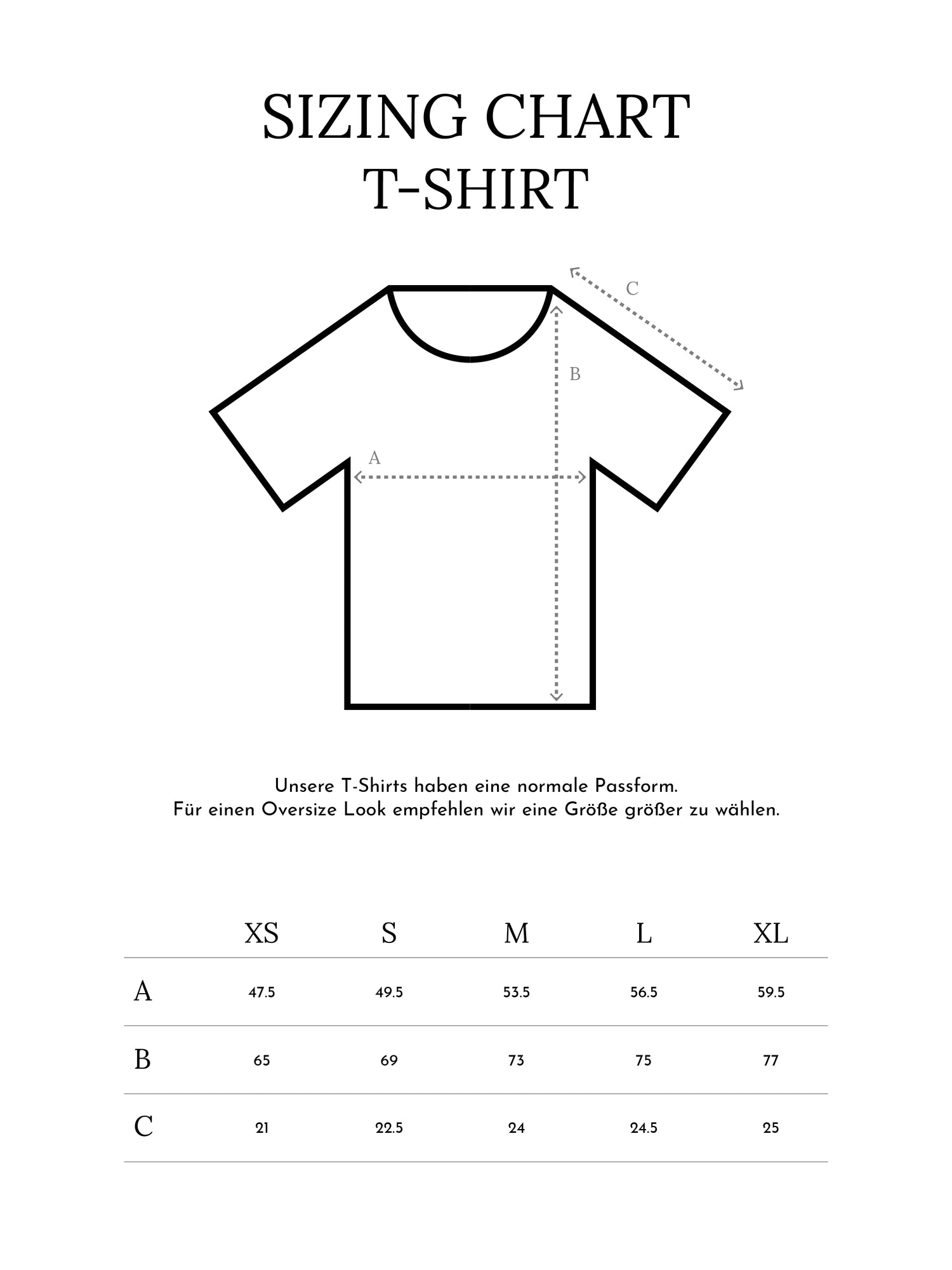 Unsere T-Shirts sind true to size, das heißt sie haben eine normale Passform. Wenn du gern Oversize trägst, empfehlen wir die eine Größe größer als normal zu bestellen.